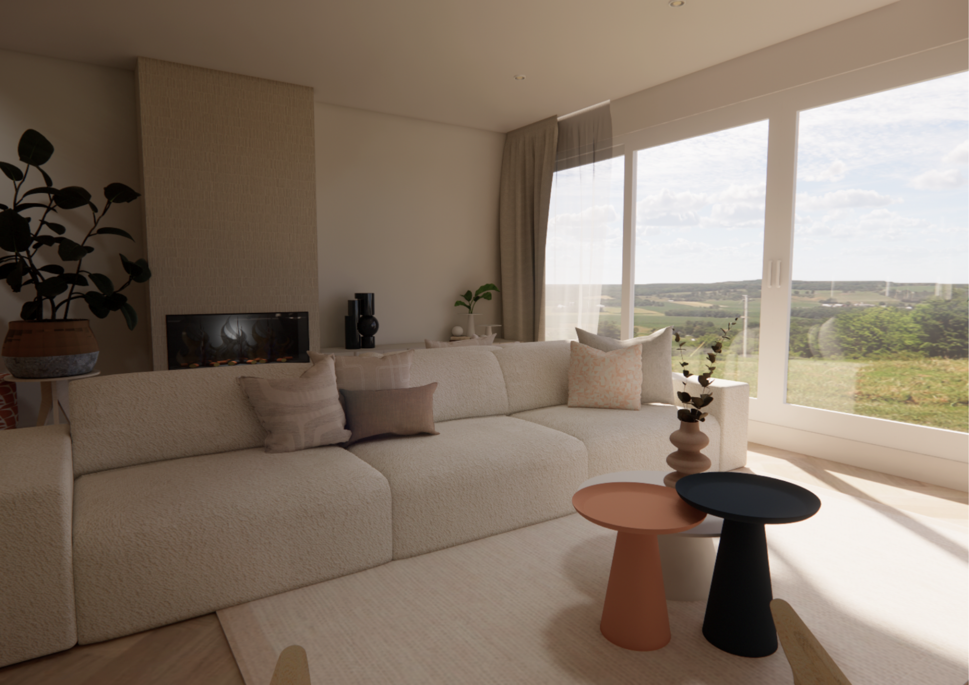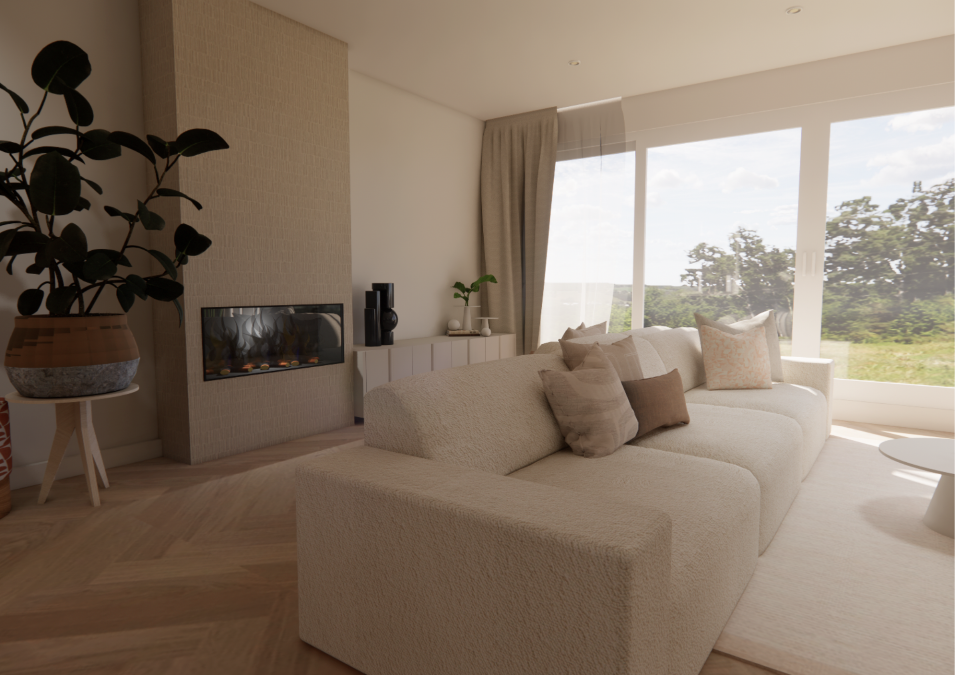 De basis bestaat uit een tijdloze visgraatvloer, een lichte keuken met zachte houtlook en een royale elementenbank die perfect balanceert tussen comfort en stijl. In de slaapkamer zorgen kleur, een openhaard en verfijnde details voor een luxe en sfeervolle uitstraling, terwijl de badkamer met gouden accenten elegantie toevoegt.